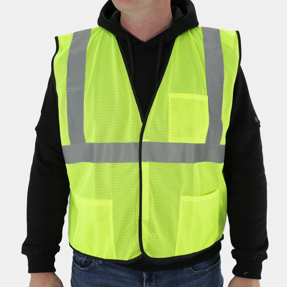The ANSI/ISEA Type R Class 2 safety vest is made of fluorescent lime polyester mesh fabric. Mesh offers more breathability in any work environment and helps keep workers seen without getting in the way. Built with 2-inch silver reflective tape for visibility in low light settings, hook and loop front closure, and one inner and two outer pockets. These vests are great for Cold storage, construction, traffic, or security applications.